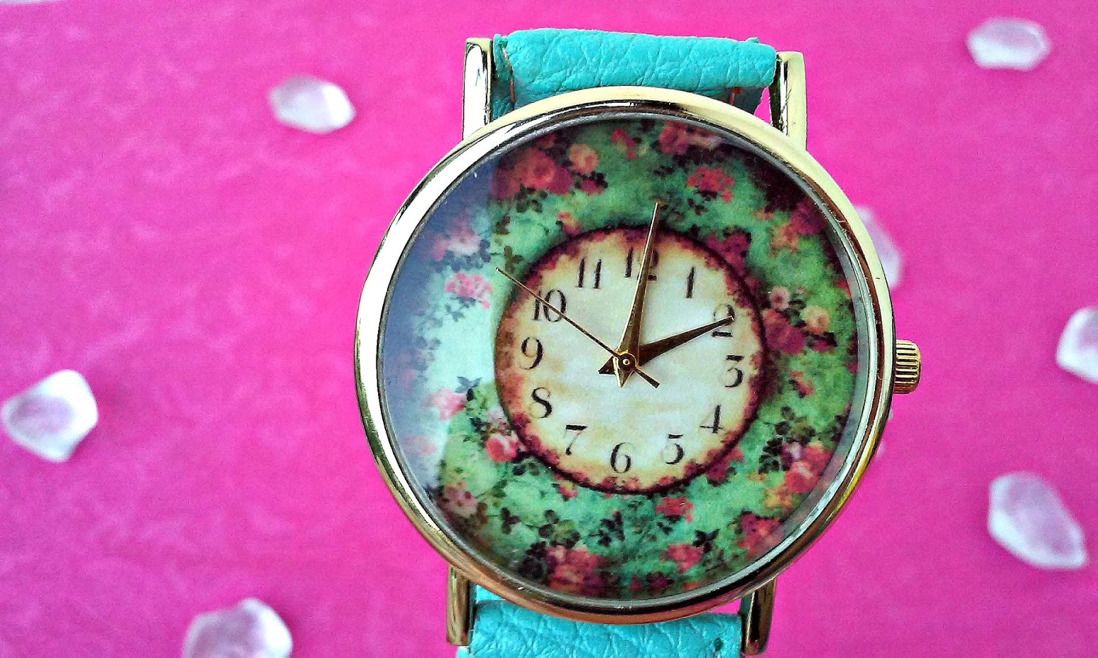 Stvarno sam se potrudila da vam što bolje dočaram koliko je ovaj sat predivan i nadam se da sam u tome i uspela. Potrudila sam se da fotografije budu što boljeg kvaliteta. Ukoliko se pitate zašto je pozadina pink boje, to je zato što se pink boja savršeno slaže sa cvetnim detaljima na sajtu kao i sa tirkiznom bojom sata. Te boje su totalno različite, ali prave savršenu kombinaciju. I zato sat dolazi do izražaja jer je prisutan kontrast. :)