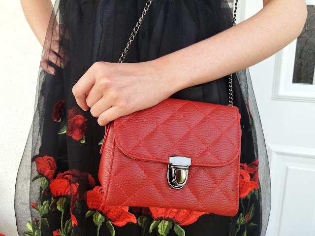 Pošto je haljina sama po sebi puna detalja odlučila sam da ne komplikujem sa drugim aksesoarima pa sam se odlučila za troslojni crni čoker sa srebrnim privescima, crvenu kožnu torbicu sa sajta Amiclubwear i omiljene sandale sa lace-up detaljima brenda Deichmann.